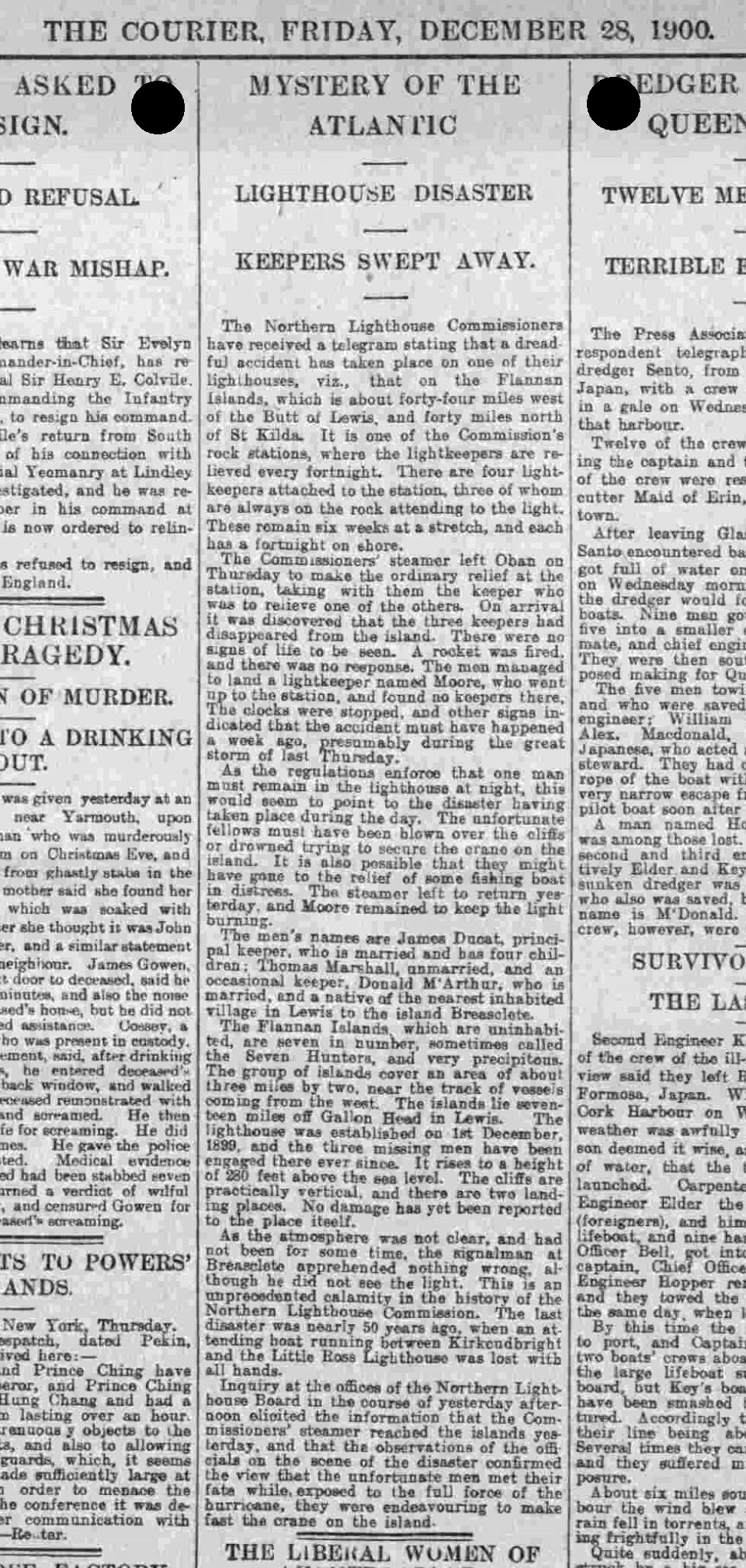 Курьер сообщил о загадочной истории маяка Эйлин Мор в статье 28 декабря 1900, назвав его “беспрецедентным бедствием” в истории Northern Lighthouse Commission.