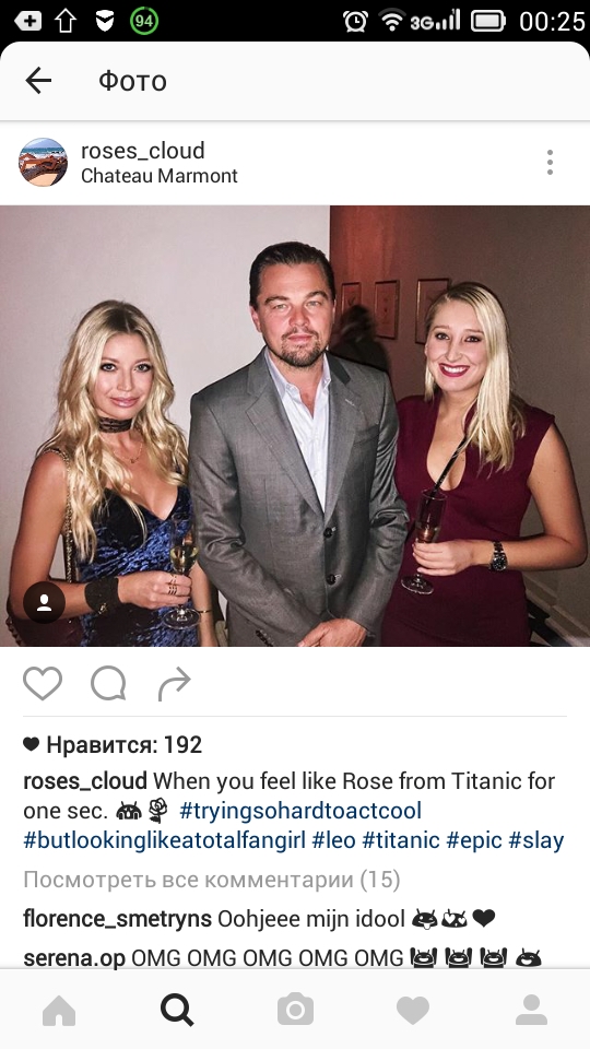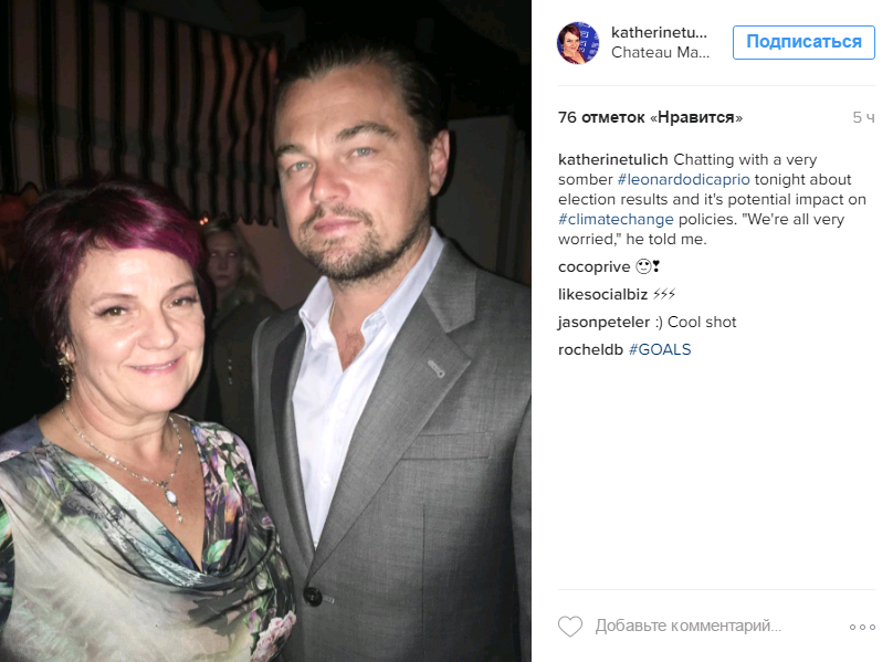 "Наслаждаюсь суперлунием сегодня с этими супер-пупер ребятами # leonardodicaprio #jonahhill #supermoon" https://www.instagram.com/leomania.br/ https://www.instagram.com/katherinetulich/ "Сегодня беседовала с очень мрачным #leonardodicaprio о результатах выборов, и это потенциально подействует на политику #измененияклимата. "Мы все очень встревожены," сказал он мне.