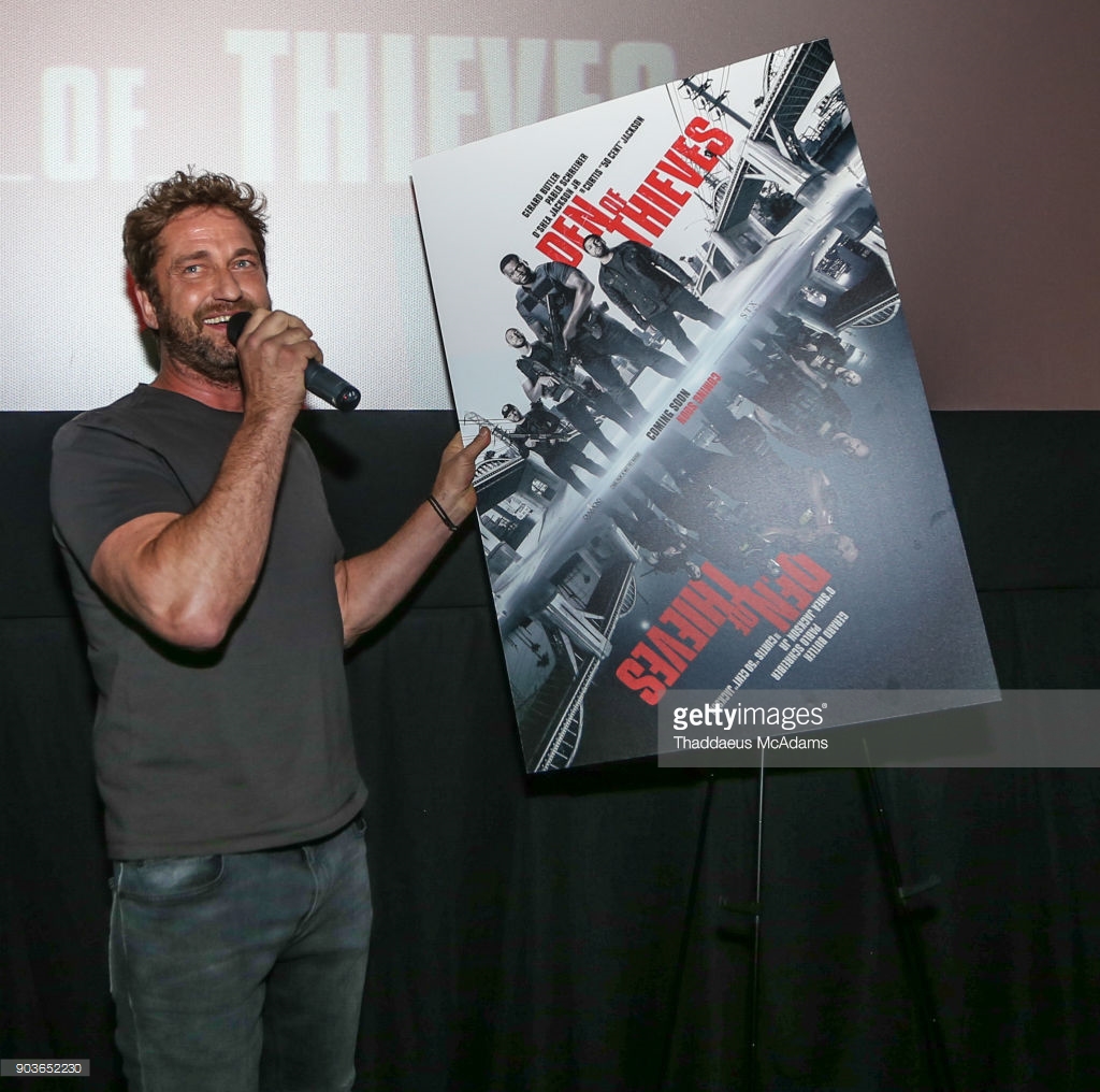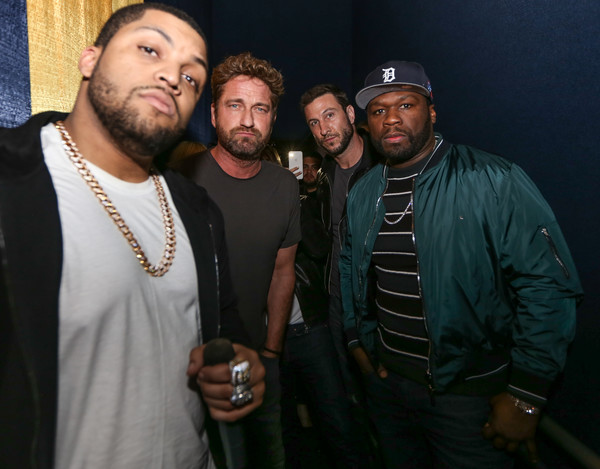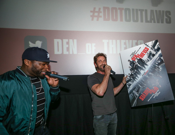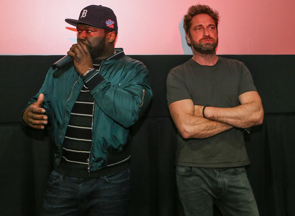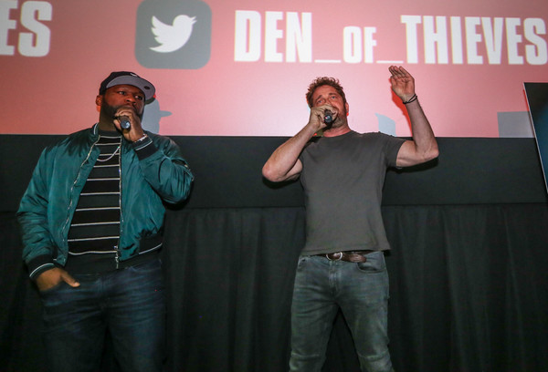 MIAMI, FL - JANUARY 10: (L-R) Curtis '50 Cent' Jackson and Gerard Butler at The Den of Thieves special screening at Regal South Beach on January 10, 2018 in Miami, Florida.