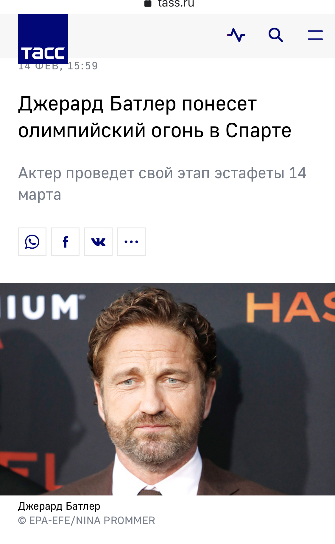 Шотландский актер Джерард Батлер прибудет в Спарту 14 марта, чтобы выступить в качестве факелоносца на Олимпийских играх 2020 года в Токио, сообщил в четверг местный мэр.