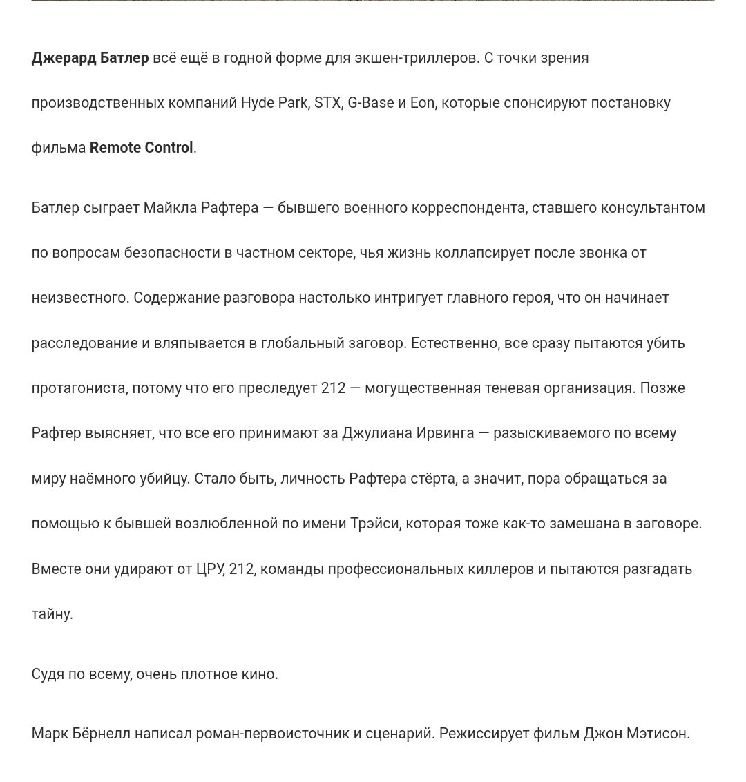 Эксклюзив: в середине семизначной сделки, upstart Euro studio Leonine предварительно купила немецкоязычные права на action-thriller Джерарда Батлера Remote Control, который продается на международном уровне компанией STX. Это самая крупная сделка, о которой сообщалось до сих пор на EFM в этом году.