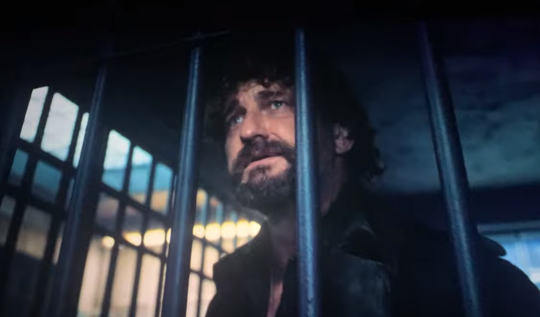 Маниакально улыбающийся Джерард Батлер на первом кадре из триллера «Полицейский участок»