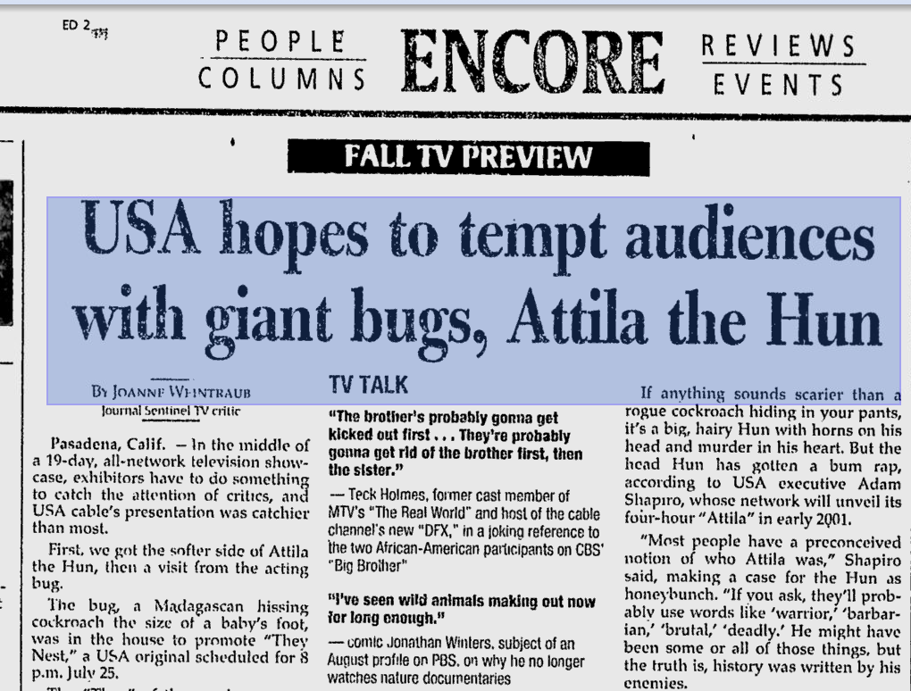 "When we told people we were producing an event miniseries about Attila the Hun, the reactions ranged from astonishment and interest to concern and disbelief," said Adam Shapiro, USA's senior vice president of longform programming. "The subject has most definitely not been tackled before by any network, which, frankly, surprised us.