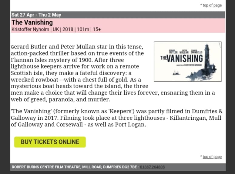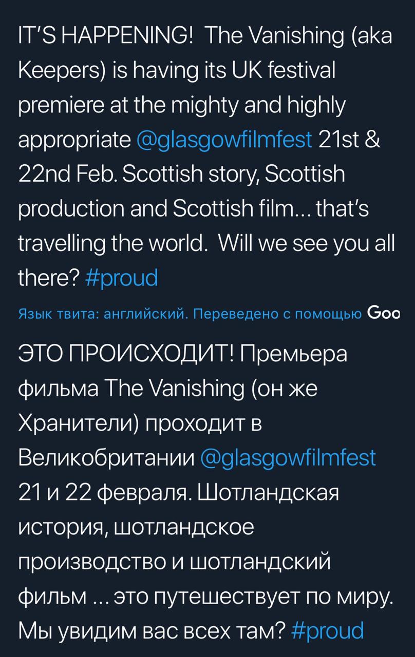 Основываясь на правдивой истории тайны острова Фланнан, Кристофер Нюхольм в захватывающей драмы #TheVanishingв главной роли @GerardButler, Питер Маллан и @ConnorSwindells, получит свою премьеру в Великобритании @glasgowfilmfestна Чт 21 Фев.