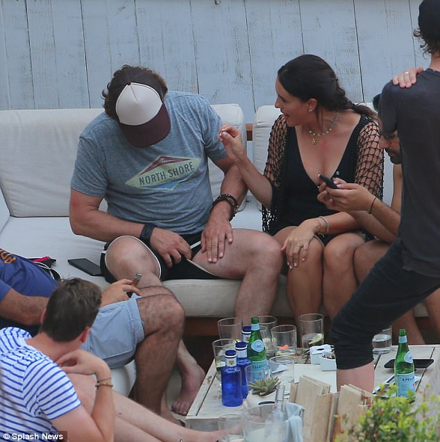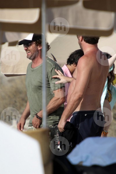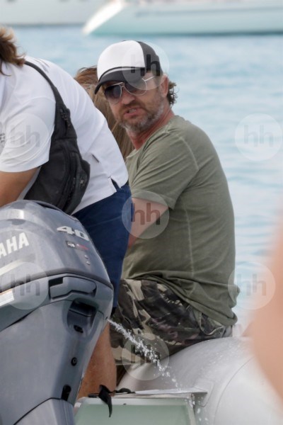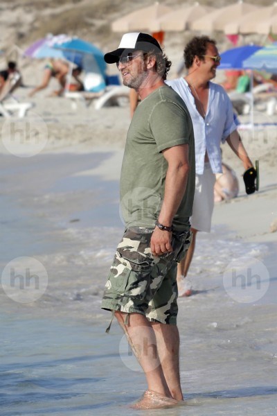 Смеющийся Джерард Батлер прижимается к подруге, когда он шутит с приятелями в пляжном клубе на Ибице
