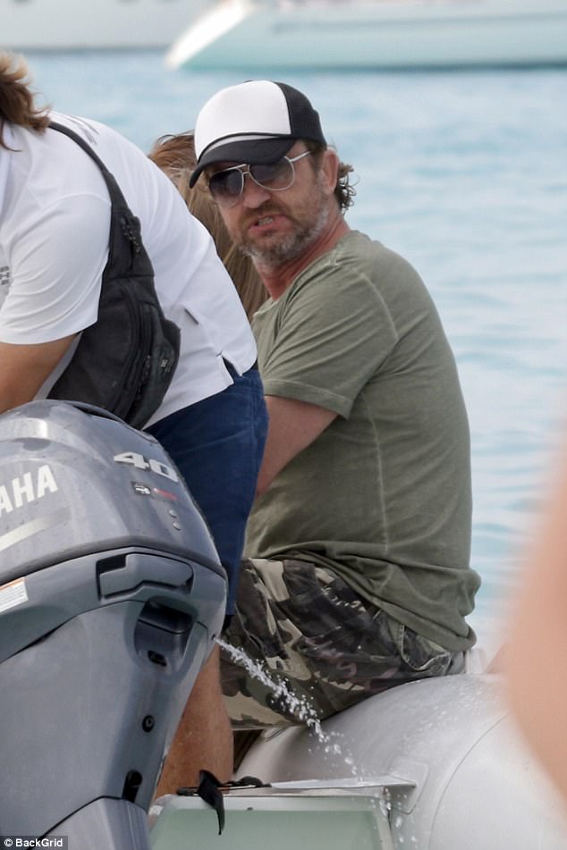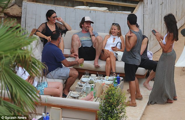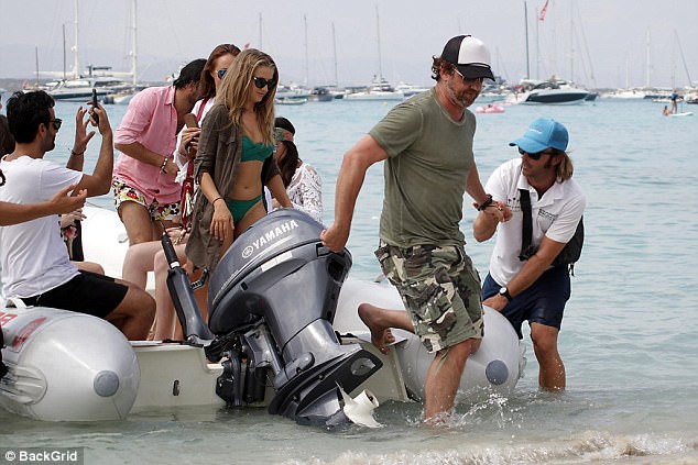 Come here, you! Laughing Gerard Butler cuddles up to a female friend as he jokes around with pals at a beach club in Ibiza