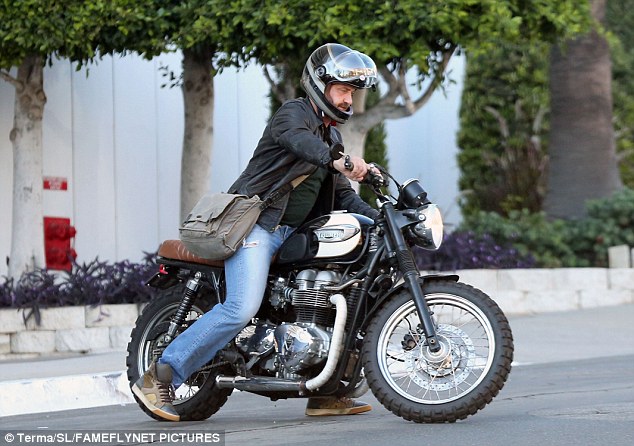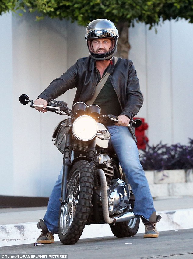 Rev your engines! Cool rider Gerard Butler rocks a leather biker jacket as he zips around on his motorcycle
