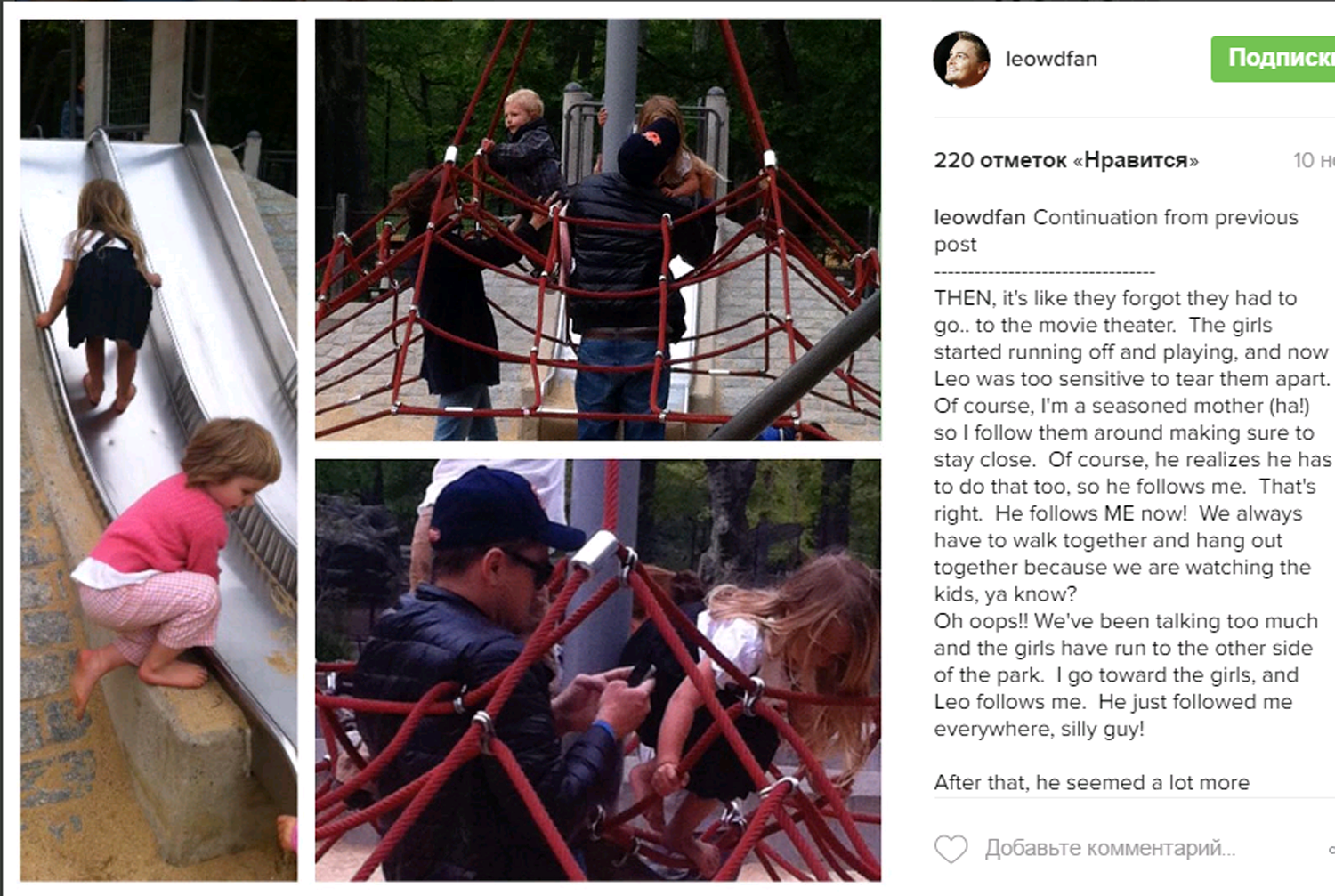 11 ноября, Лео поздравила его "экранная дочь" Жизель Эйсинбергфильме "Волк с Уолл-Стрит" ей было 5 лет), сейчас девочке 9 лет.