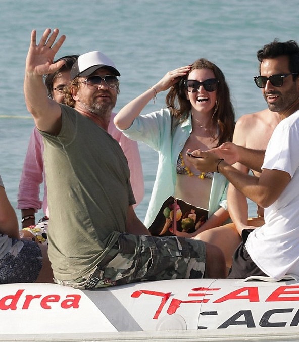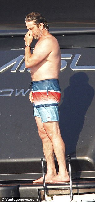 Shirtless Gerard Butler shows off his beefy frame in bright trunks as he makes a splash during Formentera getaway