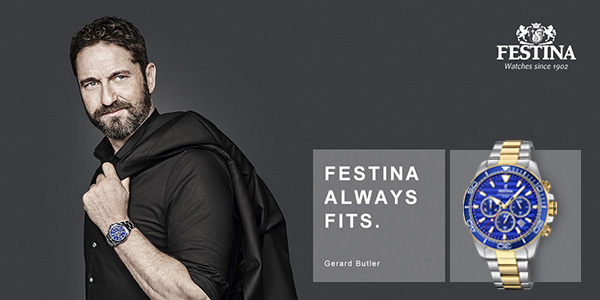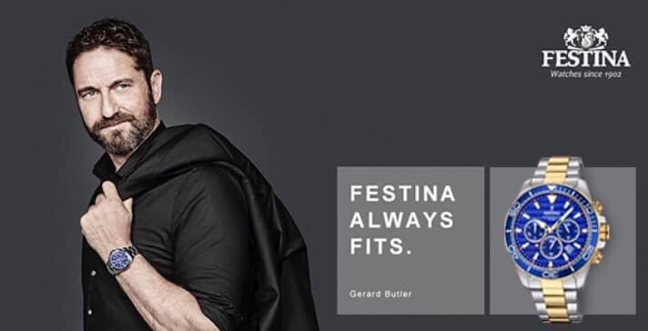 Фирма Festina часовая укрепляет свою связь со своим уже послом Джерардом Батлером, возобновляя свое сотрудничество с ним еще на три года после того, как он был хорошо принят предыдущей кампанией бренда в Голливуде, в которой шотландский актер разделял свою страсть к жизни с разных сторон его повседневной жизни. Его международный профиль, профессионализм и талант еще раз делают его идеальным кандидатом на воплощение ценностей бренда.