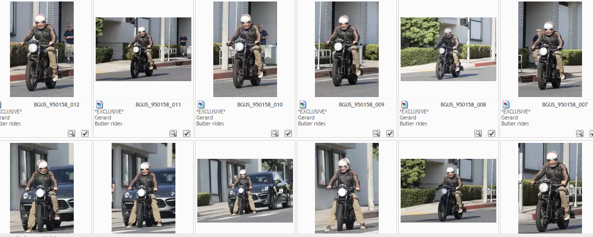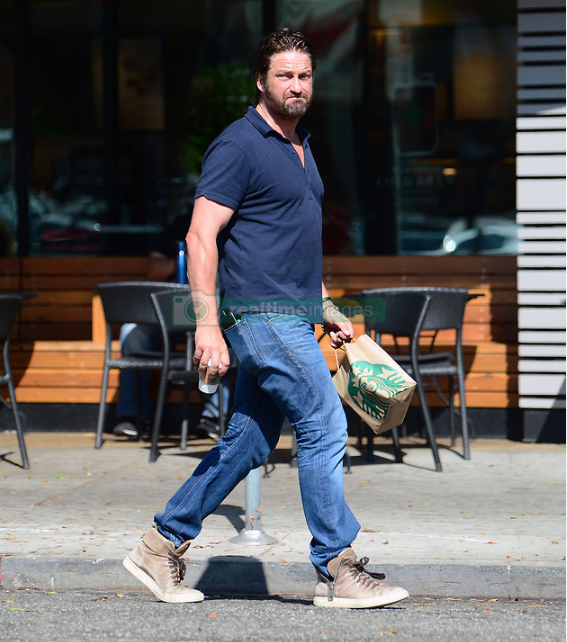 Gerard Butler rides his Triumph motorcycle around West Hollywood, LA. 11 August 2017