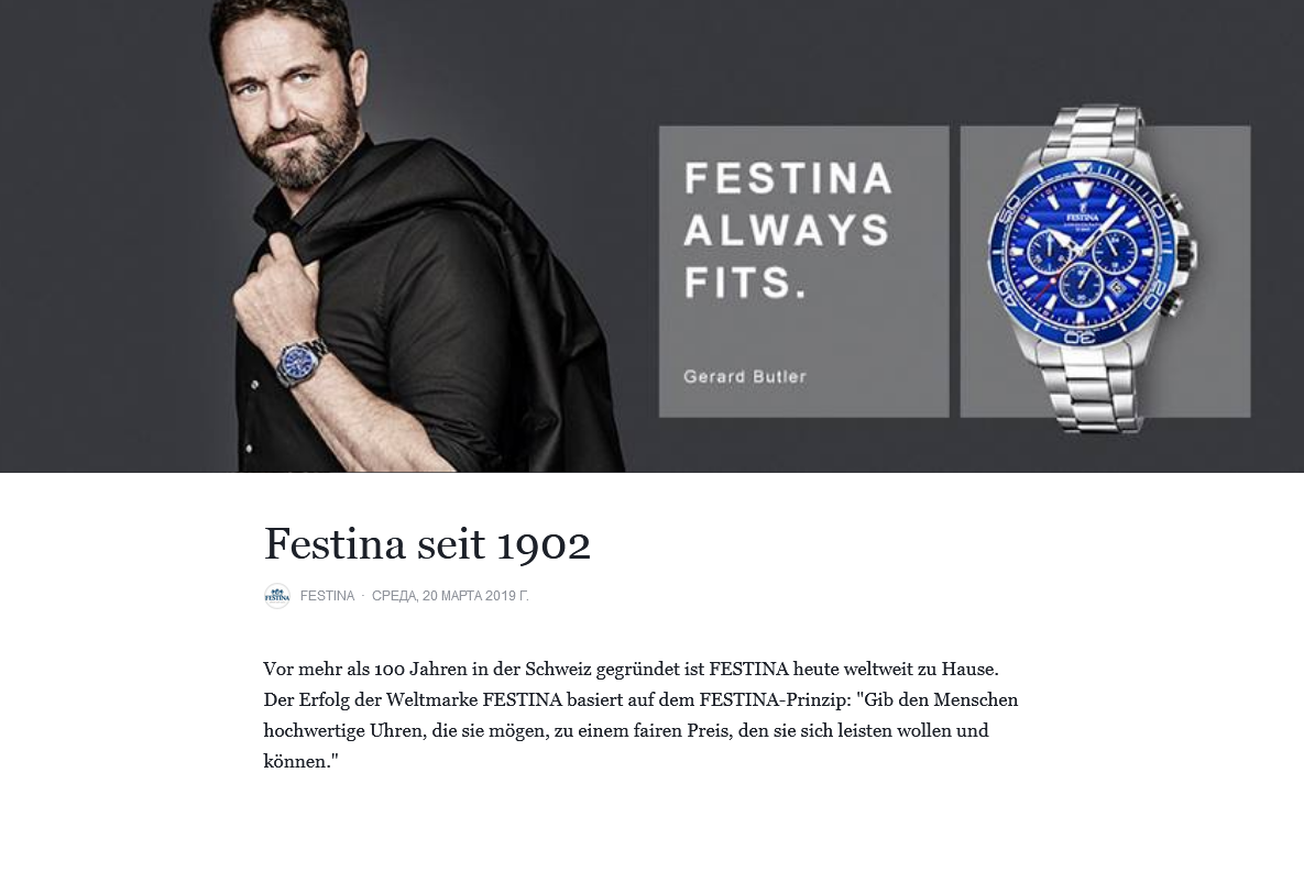 Основанная более 100 лет назад в Швейцарии, FESTINA сегодня дома во всем мире. Успех мирового бренда FESTINA основан на принципе FESTINA: «Дарите людям высококачественные часы, которые им нравятся, по справедливой цене, которую они хотят и могут себе позволить».