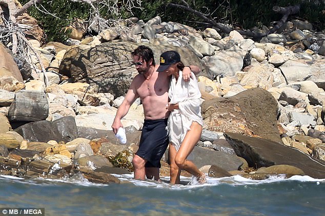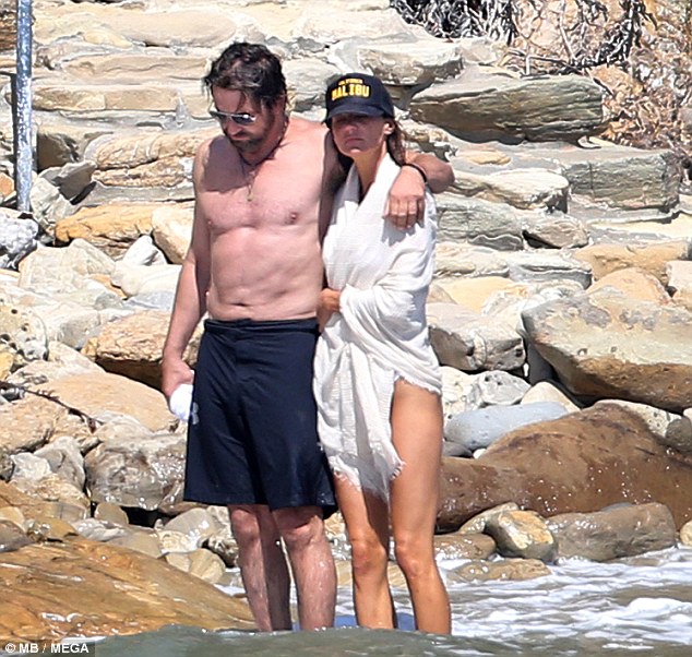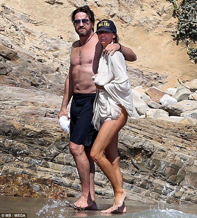 On again? Gerard Butler goes shirtless as he hits the beach with ex Morgan Brown... less than a month after the on-off couple split