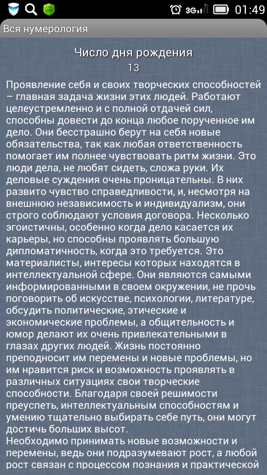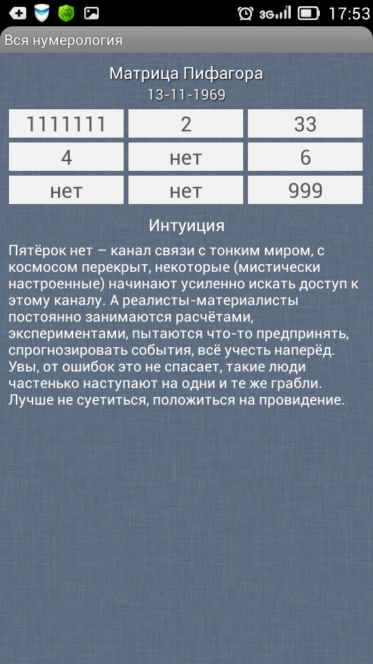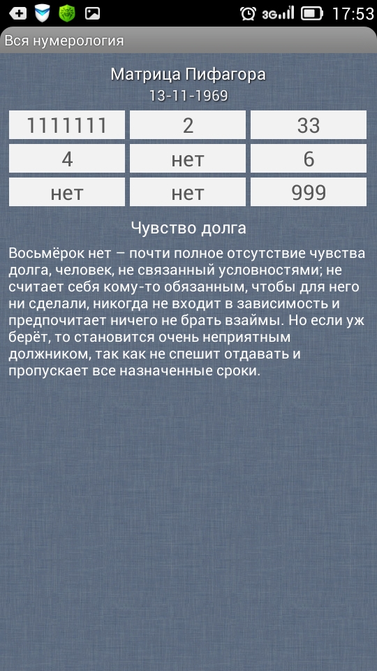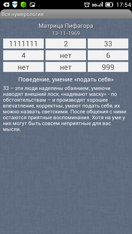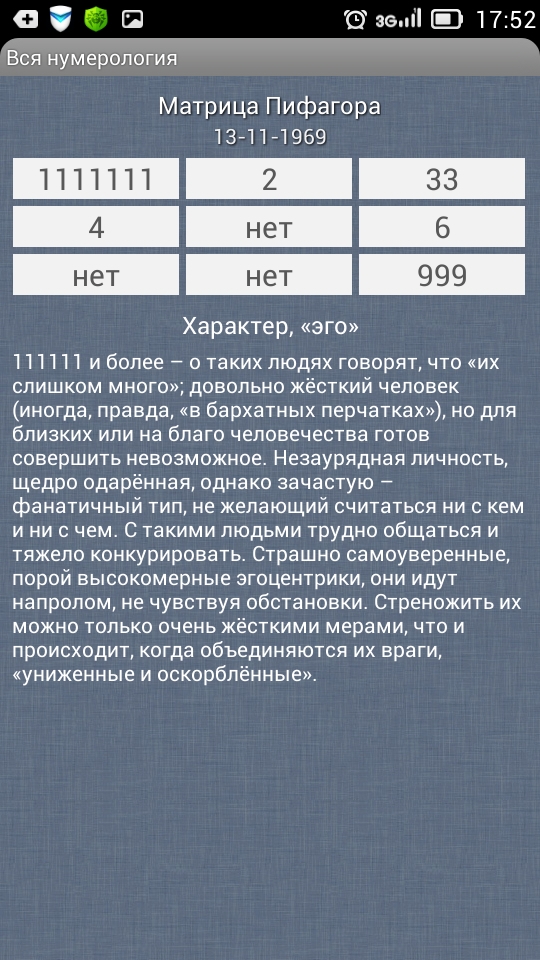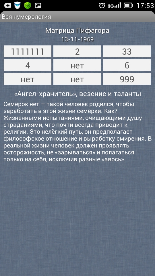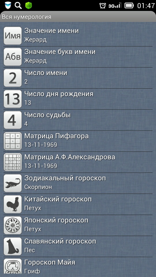 Девочки, я скачала себе приложение для смартфона "Вся нумерология" (вот об этой программе http://top-android.org/programs/5604-vsya-numerologiya/) ввела в нее данные о себе и своих родственниках (имя (кириллицей) и дату рождения) и все гороскопы и характеристики сошлись очень точно! (так что думаю эта программа дает верную информацию) :wink: Я ввела имя Жерард (так как английской G соответствует наша Ж, да и например имя Gerard по французски будет Жерар (тоже Ж), так что думаю не будет ошибкой написание Жерард) и его дату 13.11. 1969 г. вот что получилось, я сделала скрины. Мы с Roza84 подумали, что вы тоже должны это прочитать! :) ОЧЕНЬ ИНТЕРЕСНО! :D
