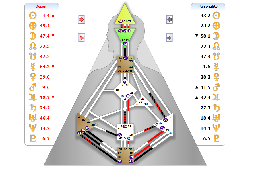 Я тут недавно увлеклась новой темой, под названием «Дизайн человека». И несмотря на то, что увлекаюсь соционикой, тем не менее, эта тема мне очень понравилась. Составила карту на себя, оказалось, очень похоже, практически все моменты совпали. Составила на всех своих знакомых, друзей, родственников. Ну и на Джерра конечно. :) Попробуйте составить на себя. Посмотрите, ради интереса. Human Design несет ключевую информацию, позволяющую в точности описать индивидуальную природу каждого человека. Бодиграф или Рейв-Мандала – это индивидуальная карта человека, по своей сути являющаяся диаграммой тела. Бодиграф показываетактивации энергетических центров тела и каналов, их связывающих. При построениибодиграфа учитывается как проявленный (сознательный) аспектчеловека, так и непроявленный (подсознательный).