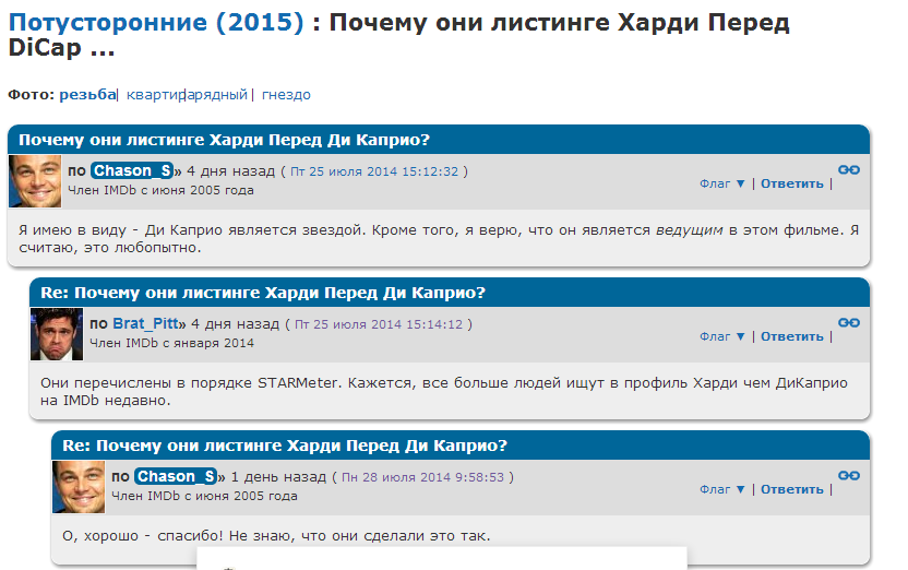 Народ там удивляется, почему имя Харди, стоит впереди имени Ди Каприо. Я правильно поняла, что очередность имен на ИМДБ устанавливается по количеству запросов по этому актеру? Таки что, нас чаще ищут чем Лео? :twisted: Что такое, этот STARMeter http://www.imdb.com/title/tt1663202/boa ... /232612214