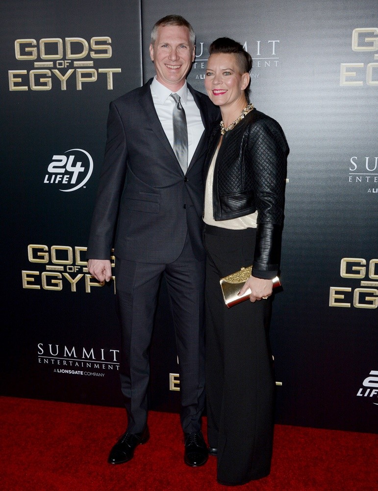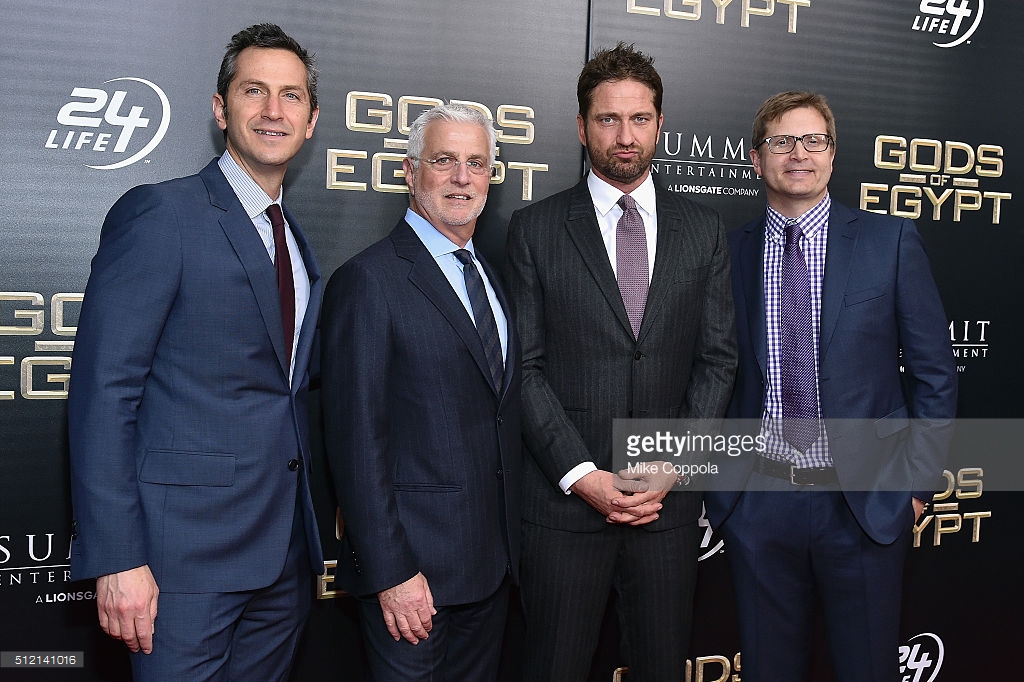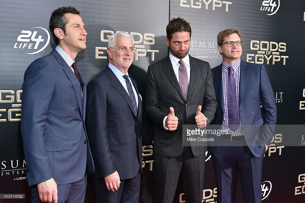 Вот прокатчики--Co-President at Lionsgate Motion Picture Group Erik Feig, Co-chairman at Lionsgate Motion Picture Group Rob Friedman, actor Gerard Butler, and President of Production, Lions gate Entertainment at Lionsgate Motion Picture Group Geoff Shaevitz attend the 'Gods Of Egypt' New York Premiere at AMC Loews Lincoln Square 13 on February 24, 2016 in New York City. А это один из сценаристов. С женой наверное. Matt Sazama, Barbara Sazama.