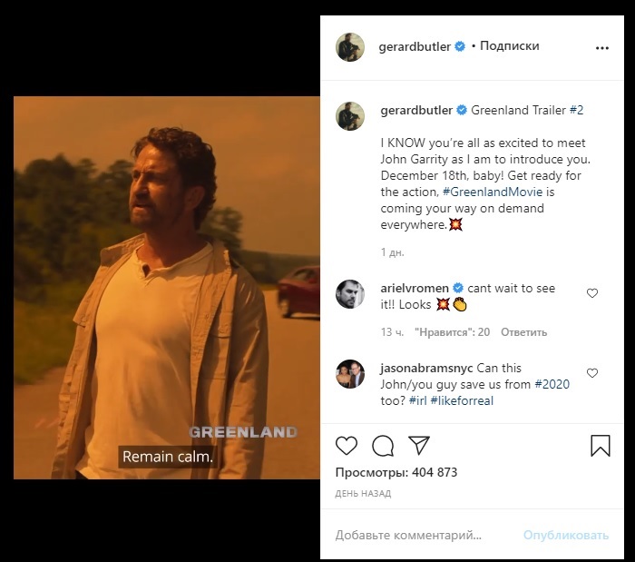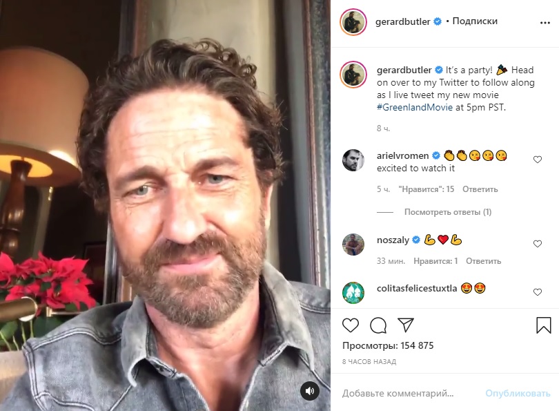 С 18 декабря "Гренландия " выходит в США. Джерард Батлер обращается к своим зрителям в Instagram