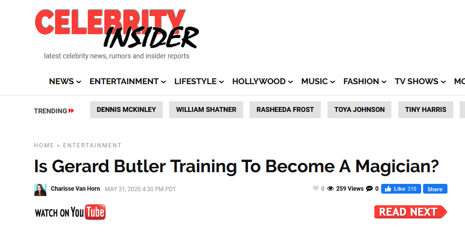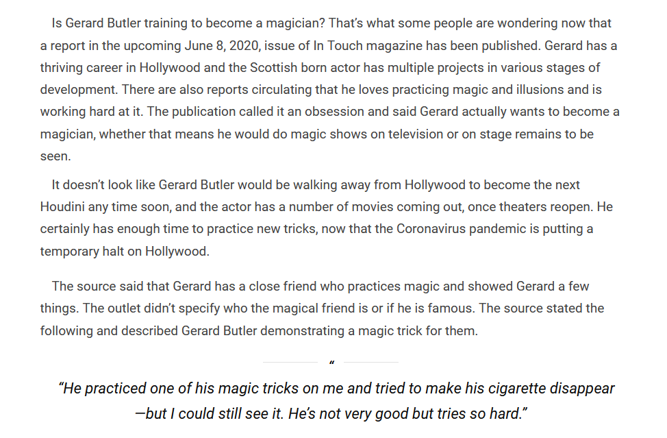 Неужели Джерард Батлер готовится стать волшебником? Это то, что некоторые люди задаются вопросом сейчас, когда был опубликован отчет в предстоящем выпуске журнала In Touch от 8 июня 2020 года. У Джерарда есть процветающая карьера в Голливуде, и у шотландского актера есть несколько проектов на разных стадиях развития. Ходят также слухи, что он любит заниматься магией и иллюзиями и усердно работает над этим. Издание назвало это навязчивой идеей и заявило, что Джерард действительно хочет стать фокусником, а значит ли это, что он будет делать магические шоу на телевидении или на сцене, еще предстоит выяснить.