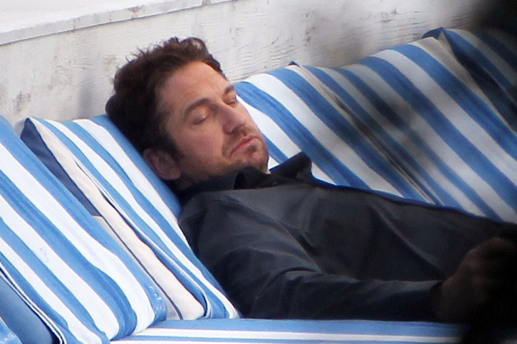 Джерард Батлер, кажется, был так измотан перед интервью в Майами в понедельник, что он в конечном итоге засыпает, лёжа у бассейна.