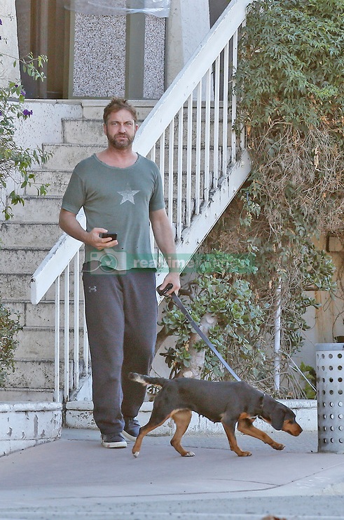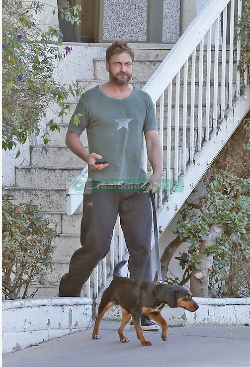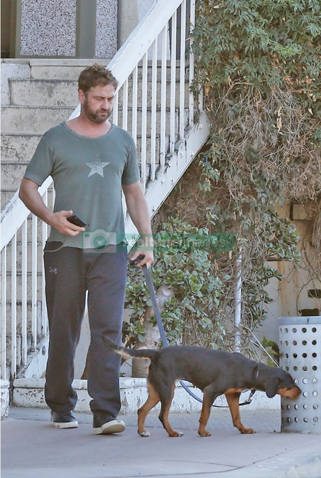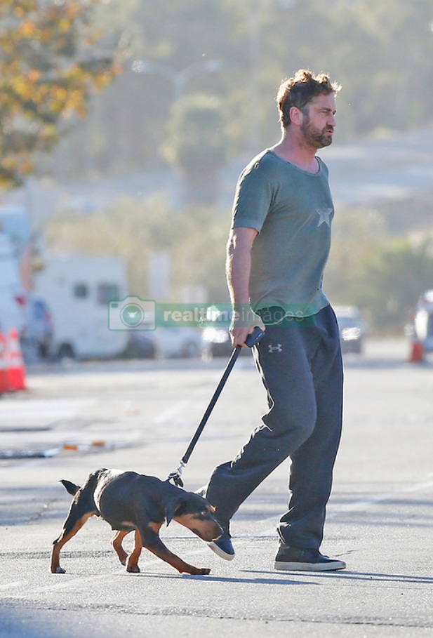 EXCLUSIVE: Gerard Butler was seen taking a stroll with a new buddy puppy at the Cross Creek market in Malibu. 17 Nov 2017