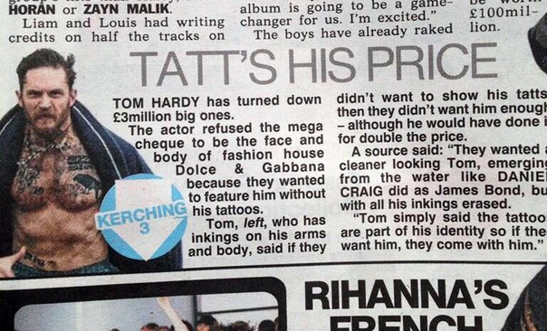Том Харди отказался стать лицом одного из знаменитых брендов "Dolce & Gabbana" а также контракта с ними в 3 миллиона фунтов! Они хотят видеть его без Татуировок, на что Том ответил "Татуировки являются частью моей идентичности, так что если они хотят меня,то примут вместе с ними." Взято из ВК)))