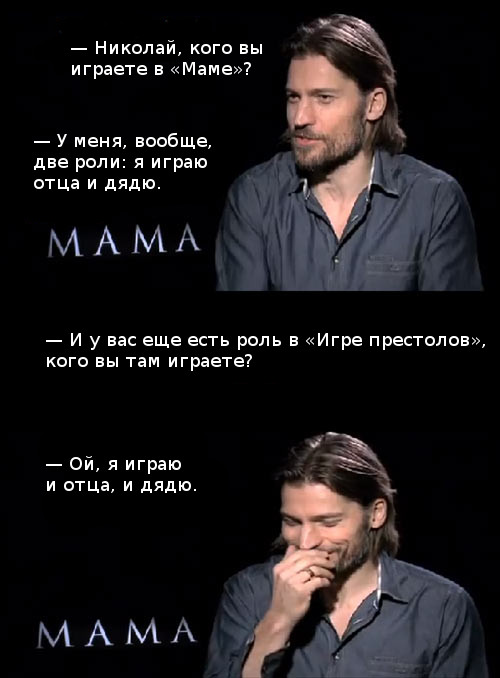 Ваш персонаж ужасен! Каково это было — играть негодяя? А негодяй ли он? Это довольно спорно. В книгах Джорджа Мартина мне особенно нравится, что его герои не являются однозначно плохими и хорошими, то есть нет деления на черное и белое. Конечно, в конце первого эпизода он совершает отвратительный поступок, которому нет оправдания. Но по мере развития сюжета вы начинаете понимать, что на это у него были веские причины. Меня привлекает именно сложность, многосторонность моего персонажа У него довольно сложные отношения с семьей, особенно с сестрой. Для меня играть персонажа, который не понравится зрителям с первого же эпизода, задача интересная. Будем надеяться, они изменят свое отношение впоследствии. То есть важно показать, как развивается ваш персонаж? Да, именно так. Я думаю, каждый из нас действует в жизни из лучших побуждений, но от этих поступков другие подчас страдают. Никто не хочет этого, люди просто поступают так, как считают правильным. Это происходит со всеми персонажами «Игры Престолов». imageВы чуть раньше упомянули книги, вы прочитали их? Я прочитал первую и жду: надеюсь, что сериал продлят на второй сезон, и тогда я прочитаю вторую часть. Но я и так знаю, что там произойдет. imageВы нервничаете насчет оценки сериала фанатами книг? Да просто в ужасе! Нет, на самом деле не нервничаю. Я верю, что большинству фанатов понравится, что они поймут и примут: сериал — это адаптация. Я также убежден, что будет — надеюсь, очень незначительное — меньшинство, которое возненавидит то, что мы сделали с их [любимыми] книгами, [любимыми] персонажами. Ведь им-то точно известно, ка́к все должно выглядеть! Но знаете, у книг много фанатов, и в целом они пока что выказывают очень большую поддержку. А наша задача, кроме того, была заполучить зрителей, которые ничего прежде о книгах не знали. Я вот ничего раньше не слышал и надеюсь, теперь многим другим захочется узнать. imageНасколько заметным было участие Джорджа в съемках? Он был одним из исполнительных продюсеров и написал сценарий для одного эпизода, но он не вмешивался в работу на съемочной площадке. Когда он бывал там, он держался очень деликатно, понимая, что все помнят о его присутствии. Он никогда не обсуждал чью-либо игру, не бросал никаких реплик, потому что знал — так актеры и разрыв сердца могут схлопотать. Представьте, он подходит и говорит: «Мне кажется, это нужно делать вот так» — и вы бы наверняка так и стали делать. Потопали бы к режиссеру и сказали: «Извините, Джордж сказал, что я должен прыгать на одной ножке, и я буду прыгать, потому что так правильно, это его видение, я точно следую его замыслу Что вам больше всего понравилось в роли Джейме? Я знаю, что будет происходить дальше, поэтому в начале сериала передо мной стояла задача сбалансировать это [последующее изменение]. Я хотел подчеркнуть неприглядные стороны героя как можно раньше, чтобы был простор для развития образа. Это было непросто. Я не хотел, чтобы он выглядел этаким сатанински хохочущим опереточным злодеем, он должен был оставаться человеком. Ему нелегко устанавливать отношения с другими людьми, он вообще неохотно идет на контакт. imageВы упомянули, что персонаж Джейме развивается, эволюционирует — соответствует ли этот процесс развитию персонажа в книге? Да, вполне. В принципе, в первом романе цикла он почти не меняется. Меняется си