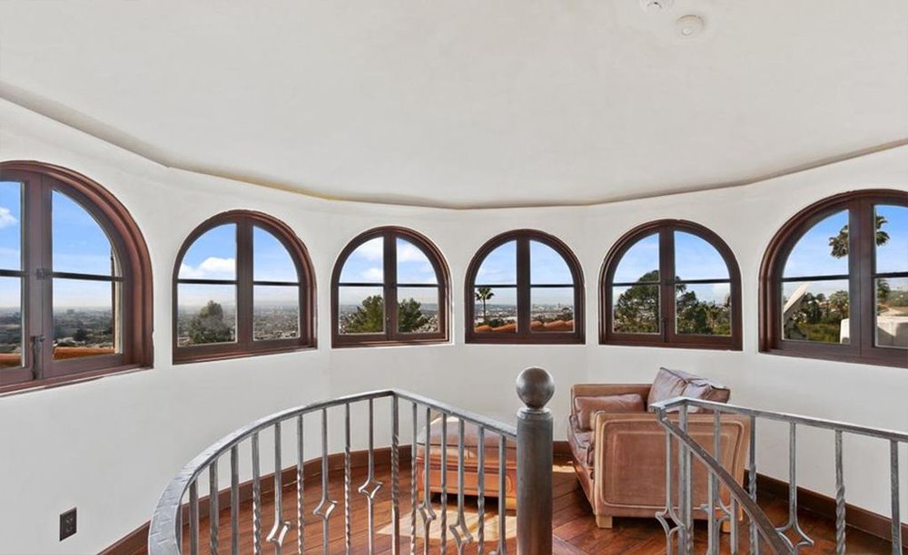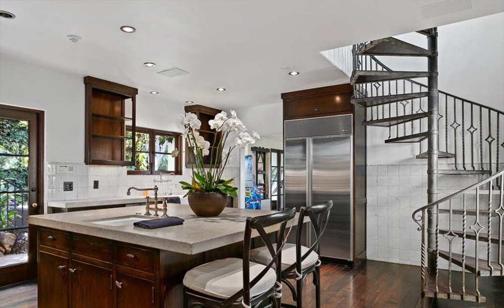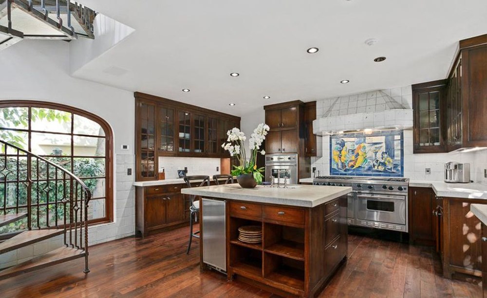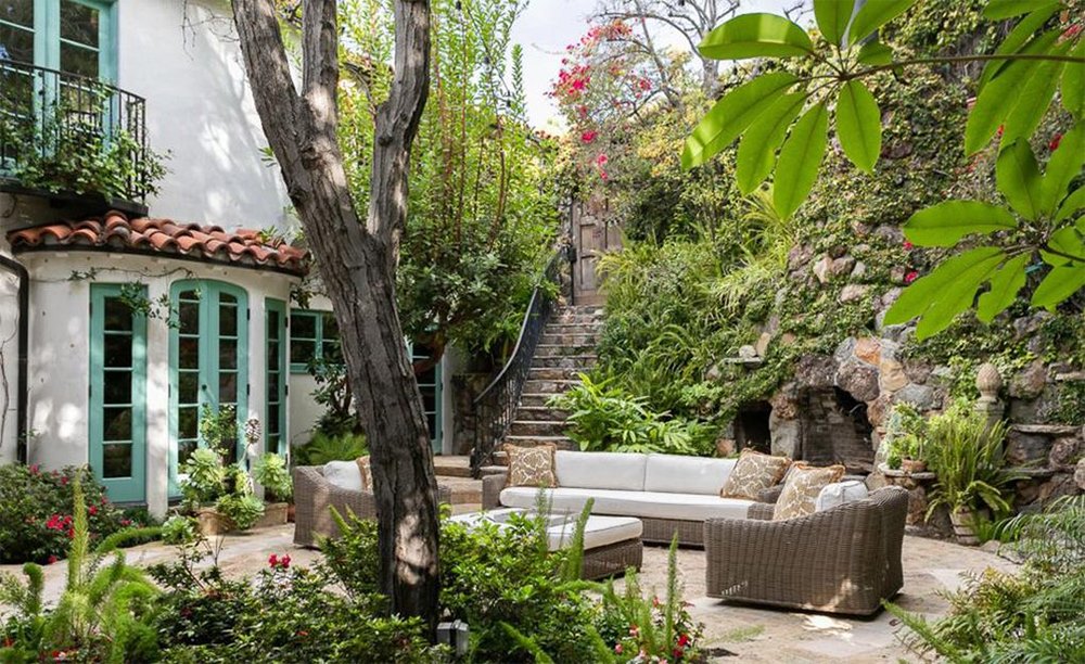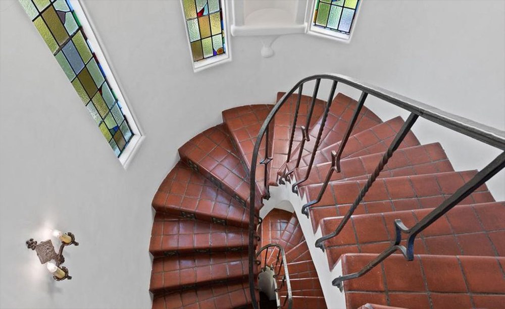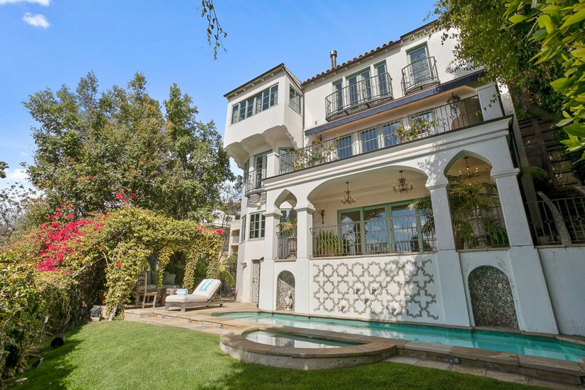 Three stories tall at the rear, with four bedrooms and four bathrooms, the almost-4,500-square-foot house was “extensively and tastefully” restored by set-designer-turned-interior-designer Elvis Restaino, and marries period details such as a turreted entry and beamed ceilings with state-of-the-art upgrades to mechanical systems and modern-day luxuries such as a screening room. A gated and secured entry courtyard with fairy lights strung through trees links, via an exterior staircase, to a petite but desirably flat backyard with a plunge-sized swimming pool and semicircular spa.