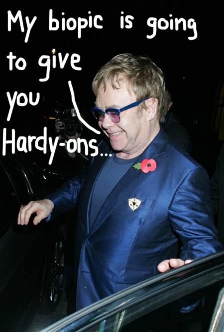 Перец Хилтон опубликовал вчерашние фотки из Лондона, на которых довольный Элтон выходит из ресторана. С комментариями в стиле: "Похоже, Элтон Джон одобряет выбор Харди на его роль"