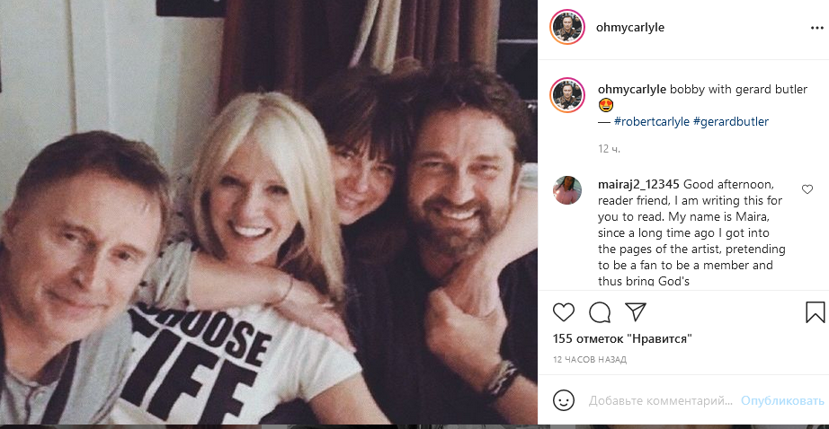 https://www.instagram.com/ohmycarlyle/ Ро́берт Карла́йл OBE — шотландский актёр, получивший известность после ролей в фильмах «На игле», «Мужской стриптиз» и «И целого мира мало», а также в сериале ABC «Однажды в сказке». Лауреат премии BAFTA.