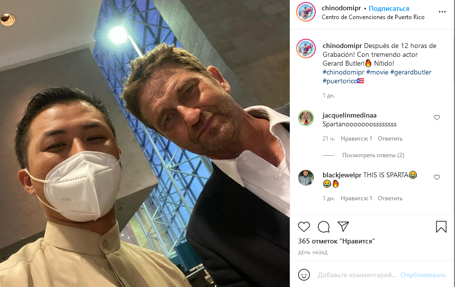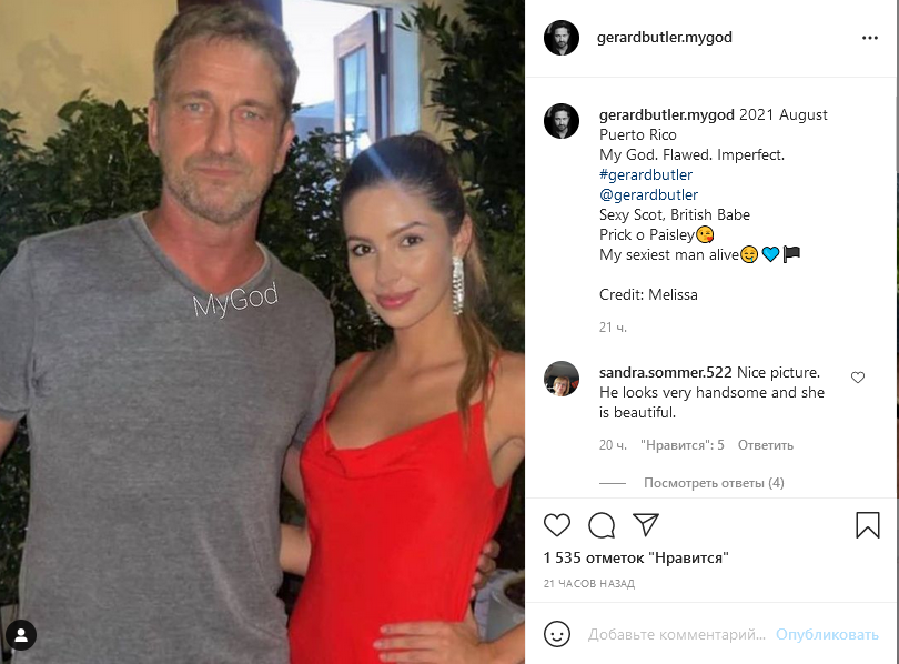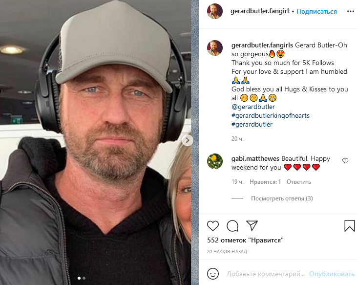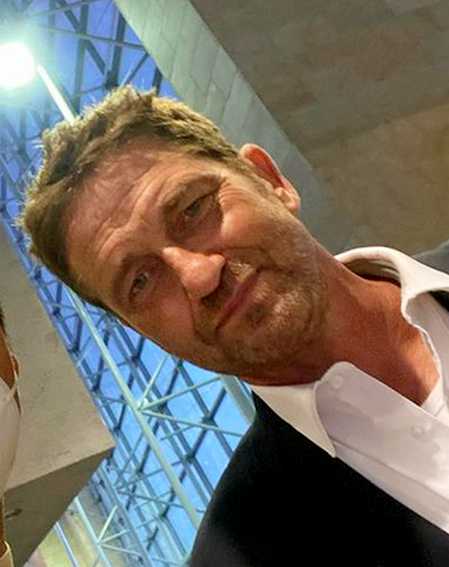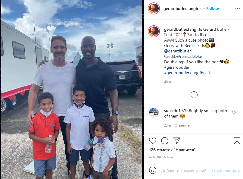 Джерарда Батлера. Он очень красивый и милый. Он в городе, снимает новый фильм.