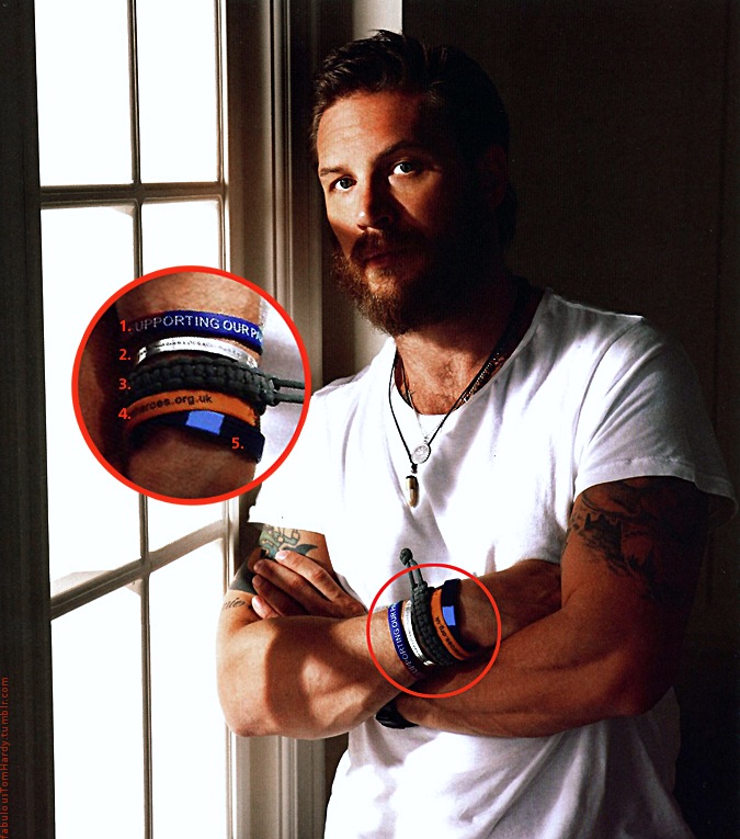 :) Том Харди - покровитель многих благотворительных организаций и имеет уважительные причины, при каждом возможном случае, носить браслеты с сответствующей символикой разных Фондов. Его коллекция довольно впечатляющая, но 5 из них, вероятно, самые важные: