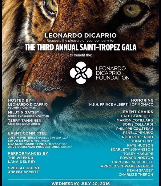 20 июля 2016 года Леонардо ДиКаприо устроит свой третий благотворительный вечер в Сен-Тропе. Его гости соберутся, чтобы обсудить пути решения самых важных проблем экологии. На мероприятии пройдет аукцион, все деньги с которого пойдут на спасение дикой природы