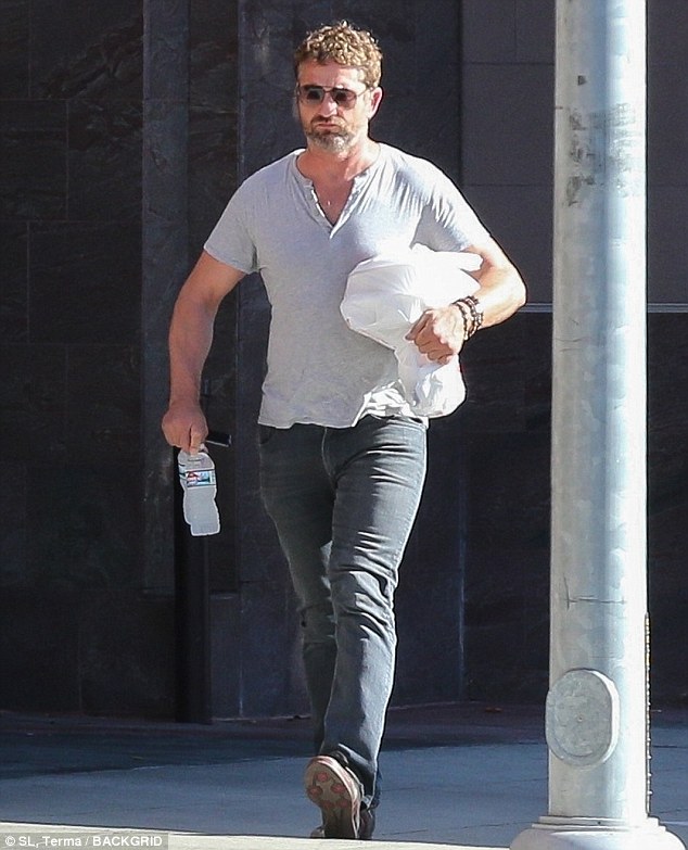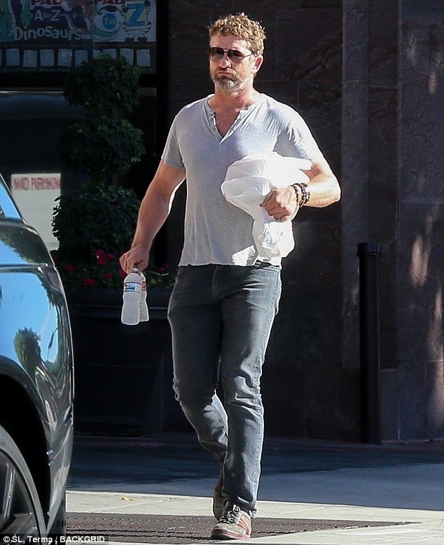 Gerard Butler cuts a rugged figure in t-shirt and blue jeans a store in Beverly Hills