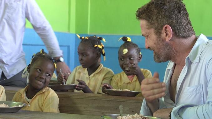 Голливудская звезда Джерард Батлер разделил еду с учениками в Гаити, которые в настоящее время помогают в школе Mary’s Meals.