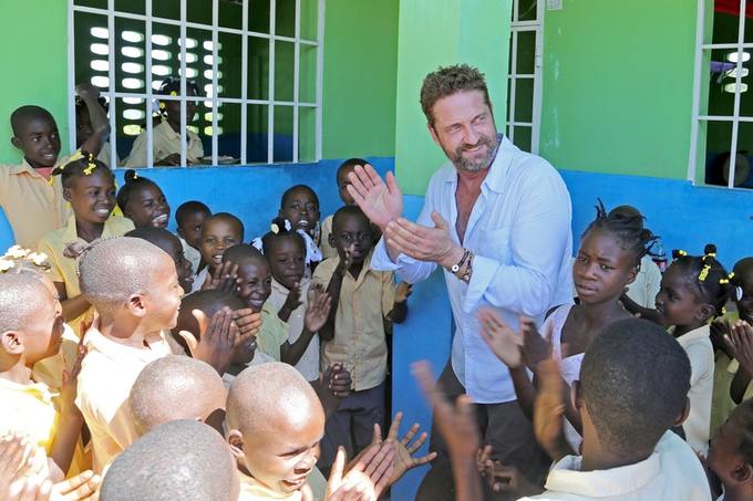 Джерард Батлер познакомился с детьми, которые получают питание Мэри во время его визита в Гаити