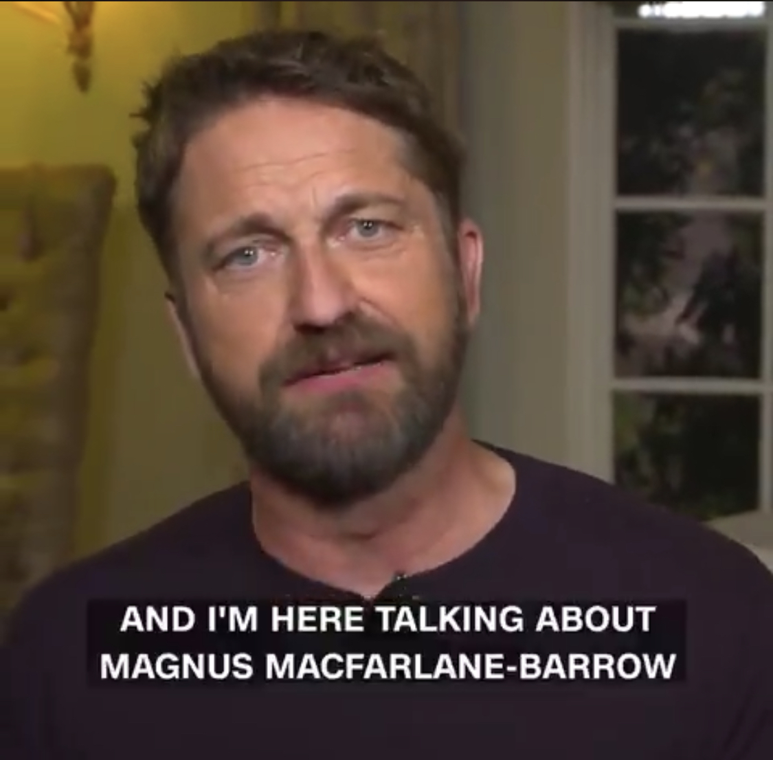 Angel Is Fallen Звезда Джерарда Батлера, чья семья в Комри, опубликовала видео, в котором рассказывает, что он поддерживает «Большую девчушку-викторину» для детских хосписов через Шотландию (CHAS), которую будет вести комик из Перта Фред МакОлей.