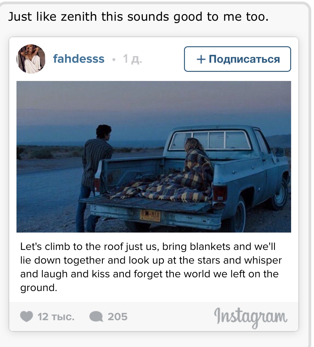 'Давай заберемся на крышу, укроемся одеялами, будем смотреть на звезды, шептаться, целоваться и забудем о мире'