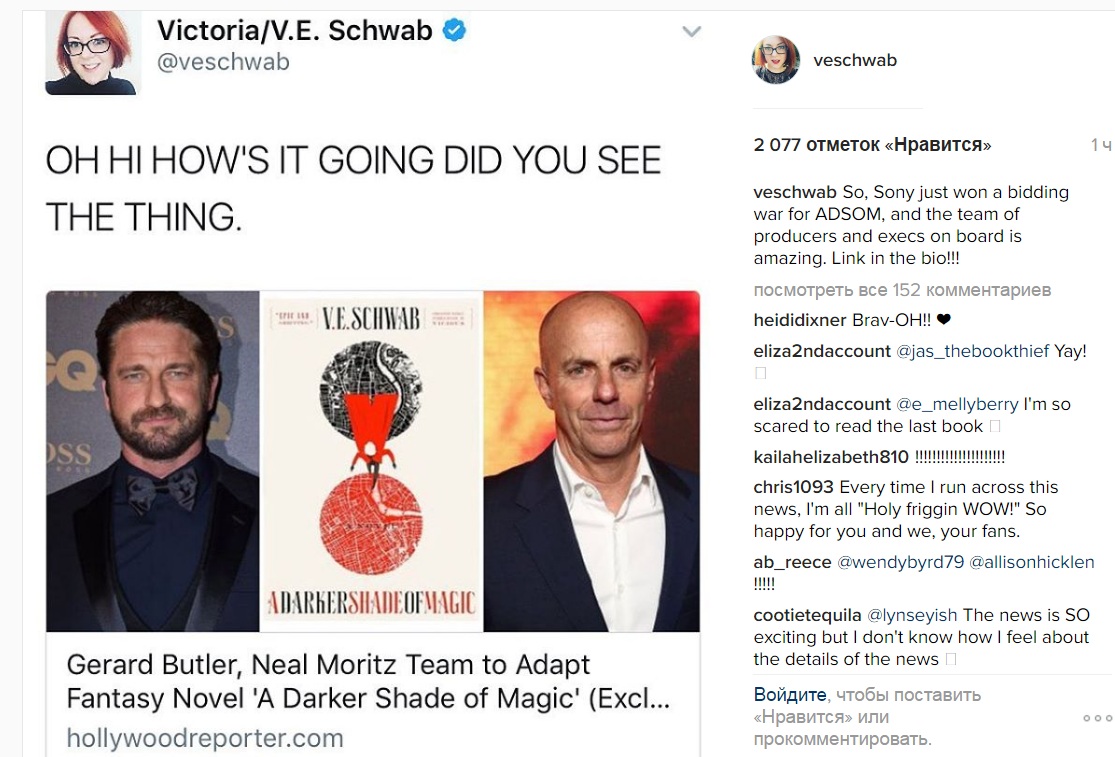 В феврале прошлого года мы сообщали, что фантастический роман Шваб "'Темный оттенок магии" будет экранизирован на телевидении компанией Джерарда Батлера G-Base. Сегодня мы рады обновить эту информацию: "Темный оттенок магии" теперь будет фильм! По данным "Голливуд репортер", Батлер будет продюсировать вместе с Алан Сигел, Дэниелем Робинсоном, и Нил Мориц. Шваб также будет продюсером.